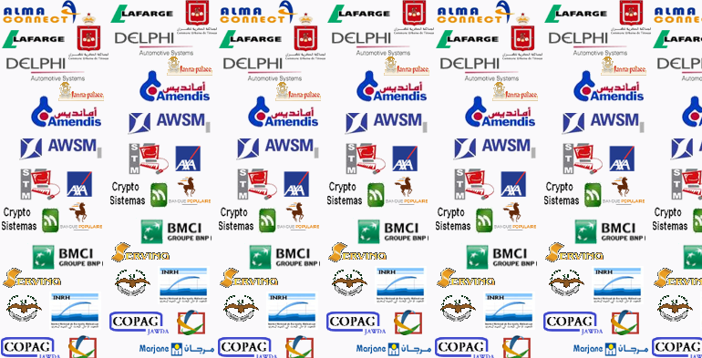 LAFARGE - Amendis - Natrax SARL - Crypto SISTEMAS - ALMA connect - Dimanord SARL - Commune Urbaine de MDIQ - Commune Urbaine de Tétouan - PC NORD - TETOUAN - Faculté Ossol Eddine - Section 1 SARL - INRH - MARJANE Holding - AXA ASSURANCES - ATTIJARI WAFABANK - AGENCE URBAINE - ATENTO - AVENTINE SYSTEMS - BMCE - BANQUE POPULAIRE - BELL MAR INFO - BMCI - CAPITAL CONSULTING - COSUMAR - COLAINORD - INRA - LA POSTE - SAKER SOFT - TRESORERIE GENERALE DU ROYAUME ...